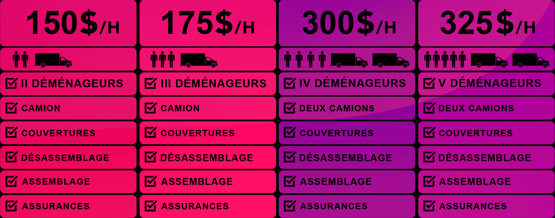 Certaines conditions s'appliquent. Nous offrons plusieurs services selon les besoins de chaque client. Déménagement, transport, livraison, voyages de longues distances et plusieurs autres.